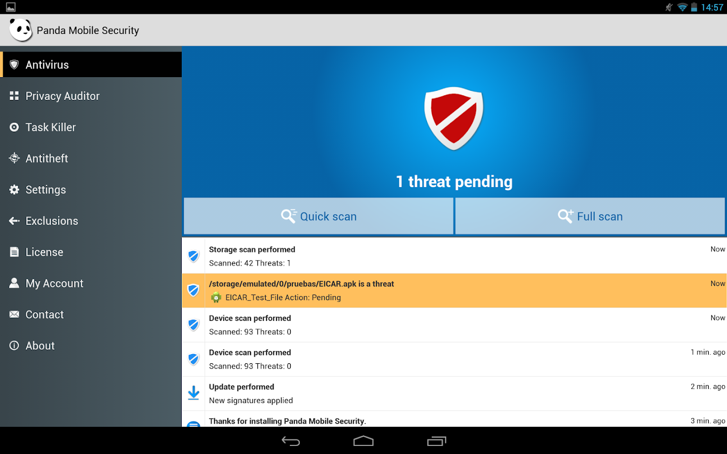 O Panda Mobile Security apresenta um layout atrativo para otimizar a sua visualização em tablets com opção de consultas e avisos ao suporte técnico.