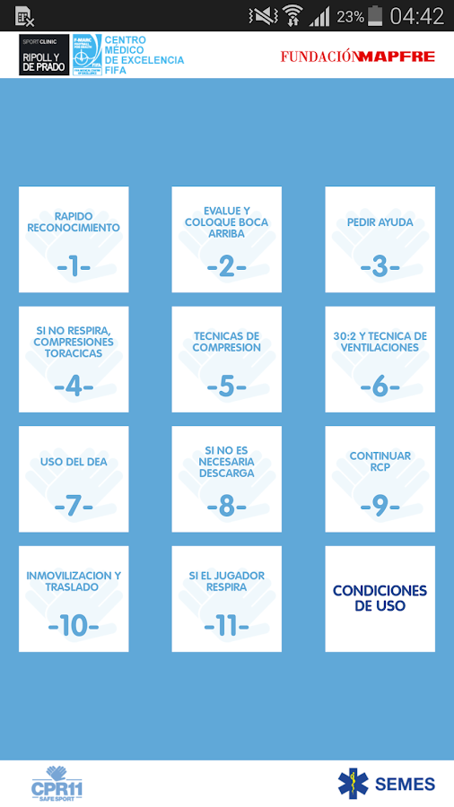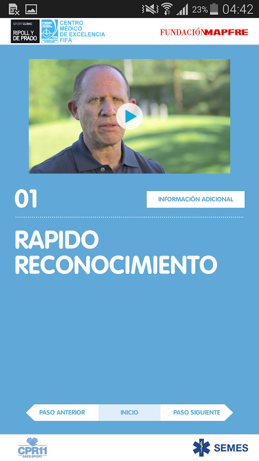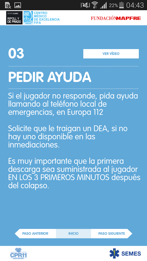 Certificada pela SEMES (Sociedad Española de Medicina de Urgencias y Emergencias) a aplicação fornece indicações simples, práticas e eficazes sobre o modo de atuar, incluindo manobras de suporte básico de vida, uso de desfibrilhador automático externo ou modo de referenciar ou proceder no transporte do atleta.
