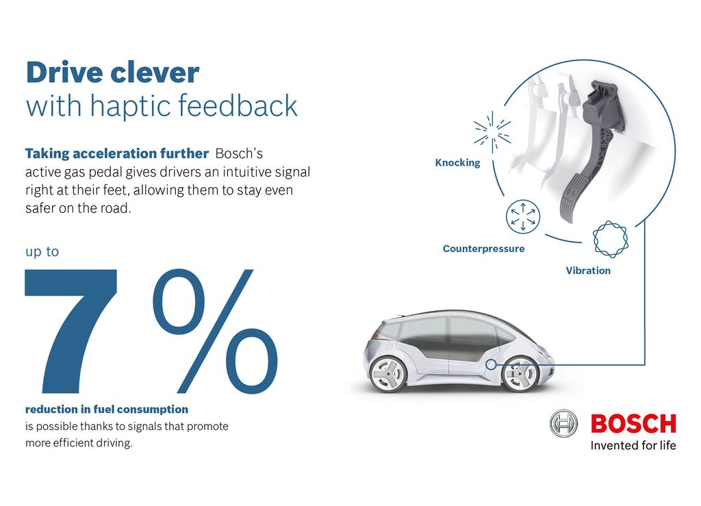 O pé do condutor é responsável por um quarto do consumo de combustível. Até agora, a única coisa que se podia fazer em relação a esta questão era conduzir cuidadosamente e fazer um curso de condução ecológica. Contudo, agora a Bosch desenvolveu uma ajuda técnica na forma de um pedal acelerador ativo: uma ligeira vibração avisa o condutor quando este exagera na pressão do pé. “O pedal acelerador ativo da Bosch ajuda os condutores a poupar combustível e, ao mesmo tempo, alerta-os para situações potencialmente perigosas”, disse Stefan Seiberth, presidente da divisão de Sistemas de Gasolina da Robert Bosch GmbH. E, se o veículo tiver um sistema de apoio, o acelerador transforma-se num indicador de perigo: associado a um sistema de navegação ou a uma câmara que reconheça os sinais de trânsito, o inovador pedal do acelerador ativo da Bosch dá ao condutor um sinal tátil se este está, por exemplo, a aproximar-se de uma curva perigosa a uma velocidade excessiva.