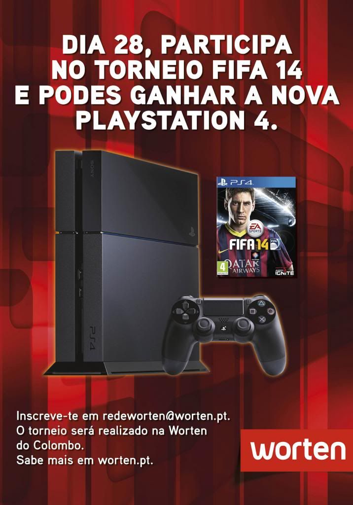 Para assinalar o lançamento da nova PlayStation 4 (PS4) no mercado nacional, a Worten do Colombo promove nesta quinta-feira, 28 de novembro, um torneio de FIFA 14, no qual os participantes terão de demonstrar as suas habilidades futebolísticas. O vencedor do torneio ganha uma PS4 com o jogo Killzone. Além disso, a partir da meia-noite, a marca tem uma oferta especial para os primeiros 50 clientes que comprem a consola.