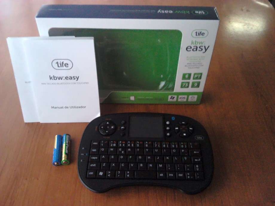 O teclado kbw:easy é apenas acompanhado de duas pilhas AAA e pelos manual de utilizador em inglês e português. Não é fornecido qualquer adaptador bluetooth, o que limita a sua utilização a dispositivos que já disponham desta tecnologia, ou nos obriga a comprar um em separado.