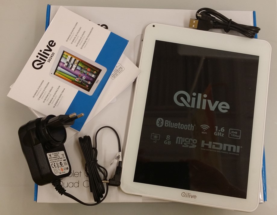 Na embalagem encontramos o manual de instruções (em Português), garantia, cabo USB, um carregador e o tablet QiLive.