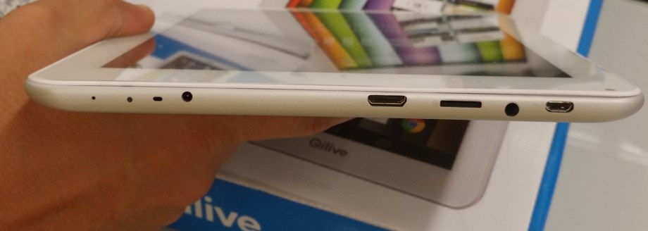 O QiLive apresenta, no topo, as habituais ligações: micro-USB (que lhe permite ligar um cabo USB e transferir, por exemplo, dados entre um computador e o tablet), ligação jack 3,5mm (para a ligação a uns auscultadores ou colunas de som), leitor de cartões microSD (que pode ser usado também para aumentar o espaço de armazenamento do tablet), ligação mini HDMI (para poder ligar um televisor ao equipamento e reproduzir a imagem do tablet no ecrã TV), ligação ao carregador e, para finalizar, um pequeno orifício que permite realizar um “reset” ao equipamento.