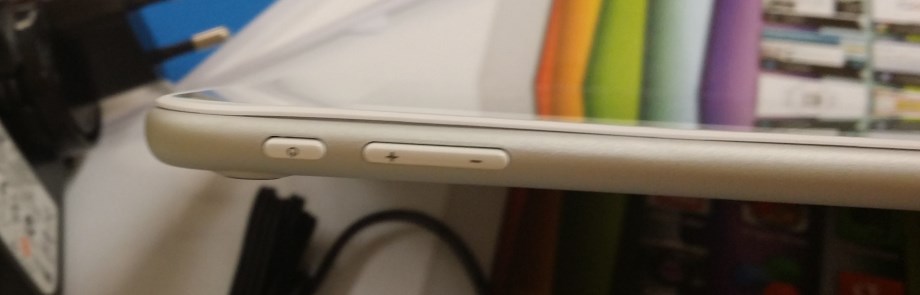 Na lateral do tablet, temos o botão de On/Off e o controlo de volume com dois botões (cima e baixo).