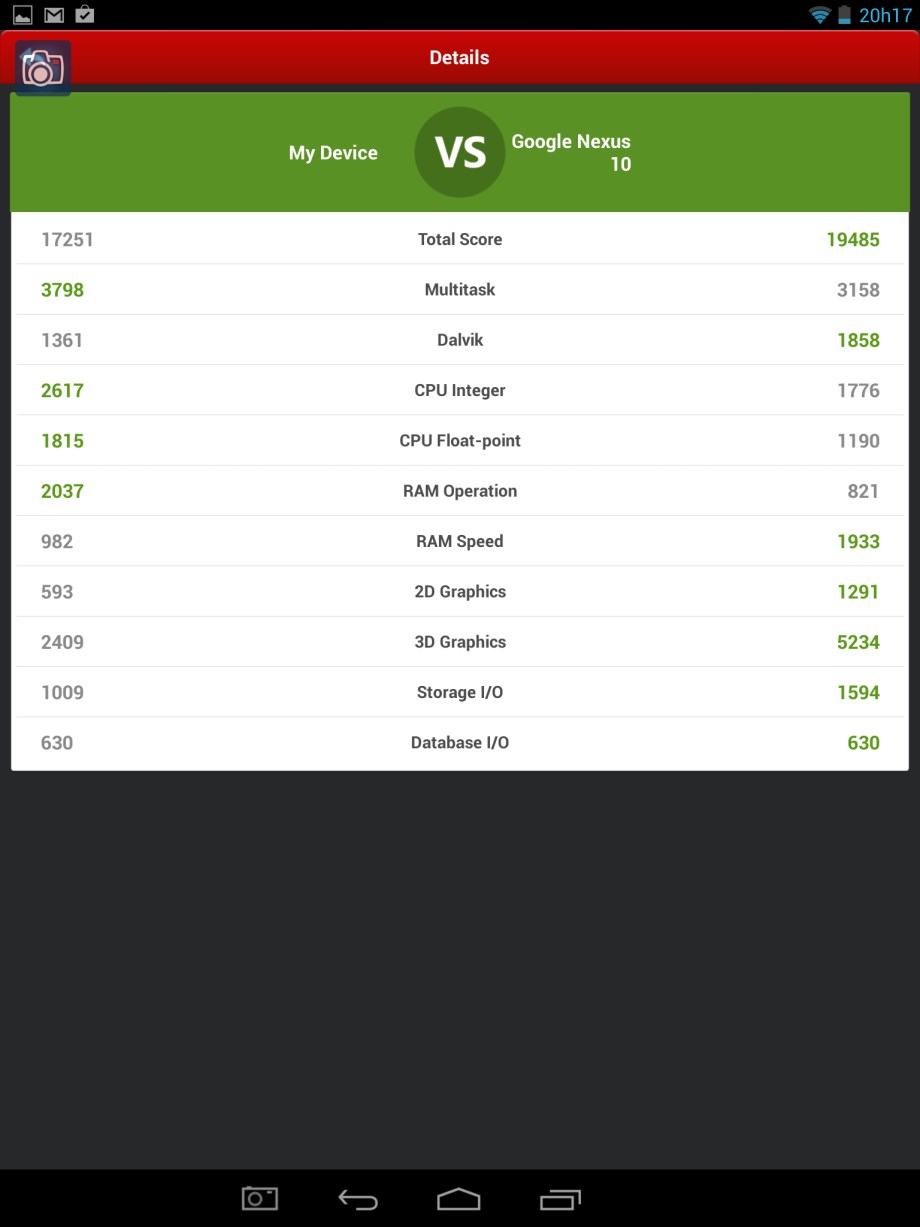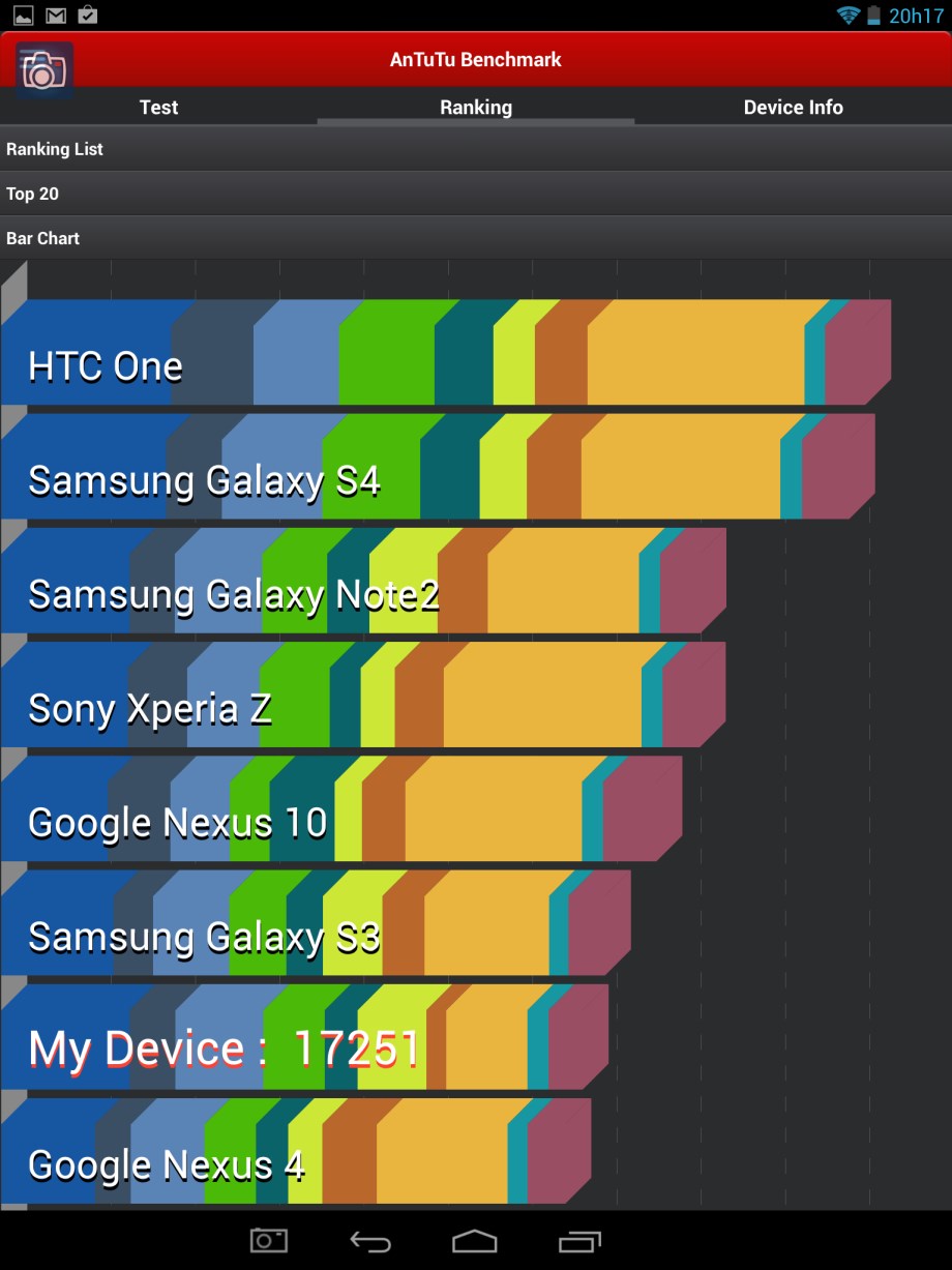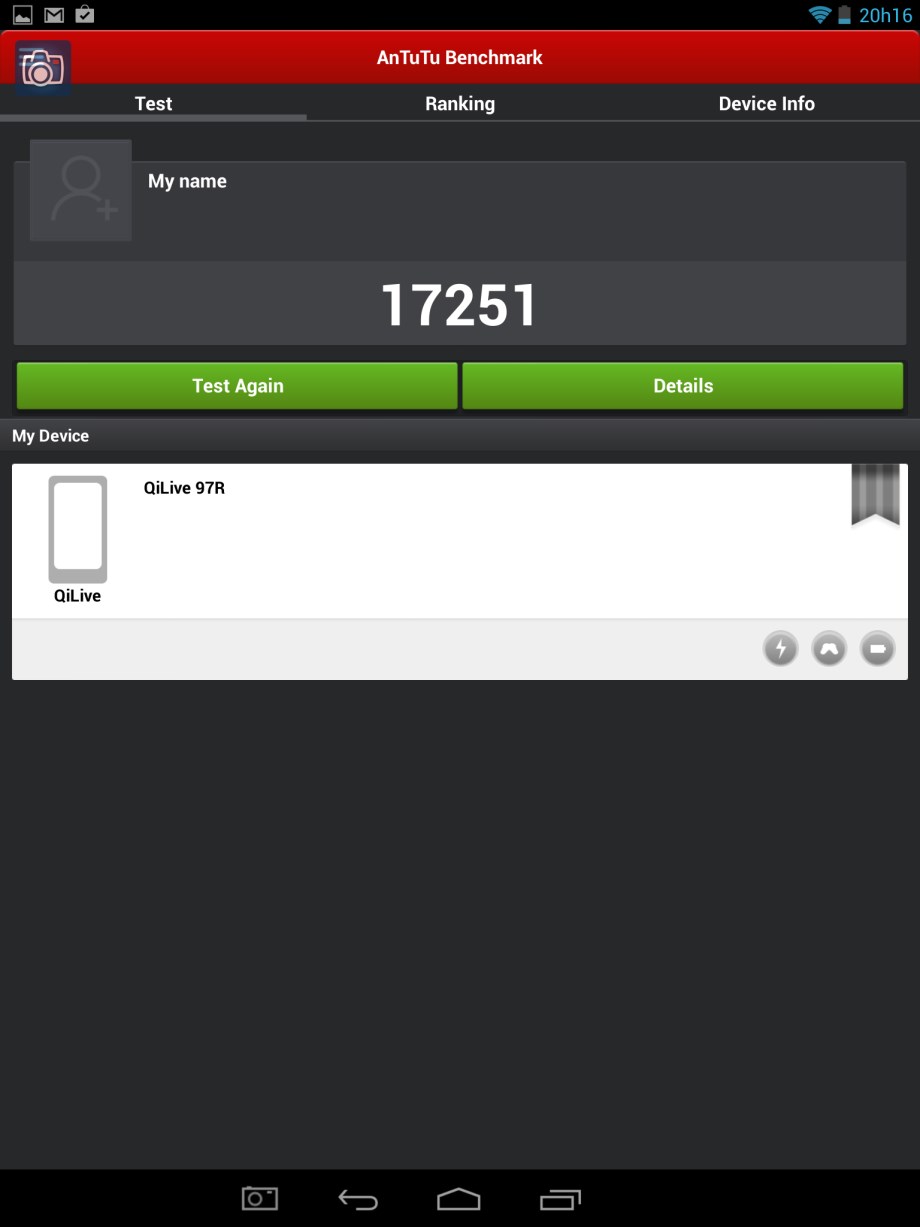 Como forma de teste, optámos por instalar um dos softwares existentes na PlayStore para obter resultados de benchmark. Escolhemos a solução AnTuTu Benchmark que ao longo de vários minutos realizou testes à placa gráfica, memorias, processador e desempenho. A vantagem desta aplicação é que permite comparar com outros modelos existentes no mercado. Assim, e após os testes, foi possivel comparar o comportamento do QiLive com outros equipamentos. A título de exemplo, o nosso QiLive ficou ligeiramente abaixo do desempenho do Galaxy S3, ficando acima do Nexus 4.