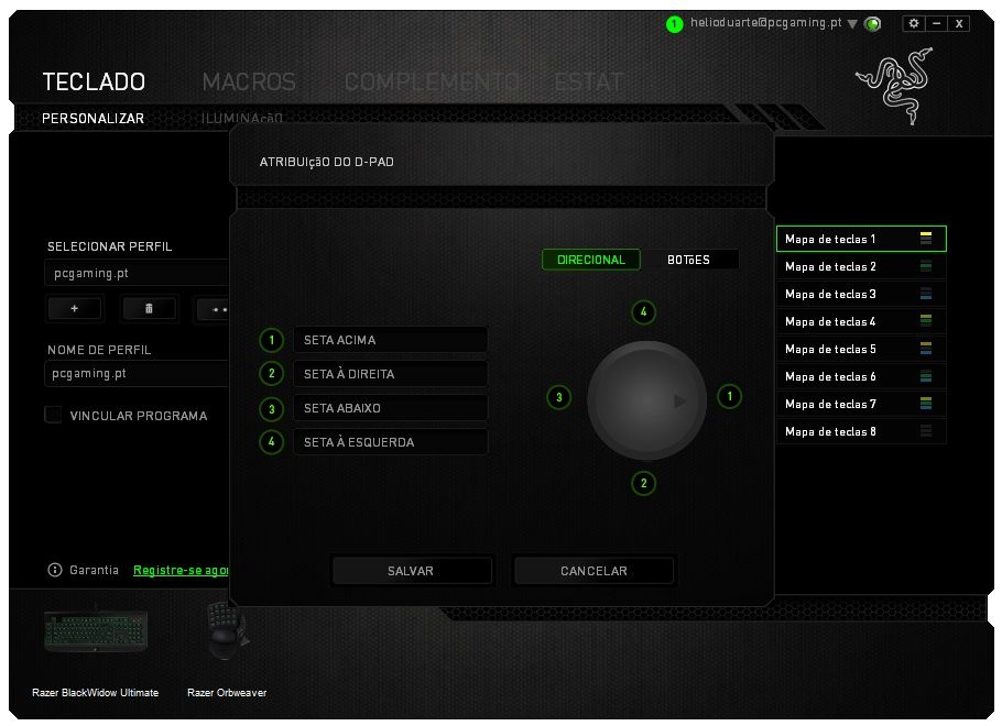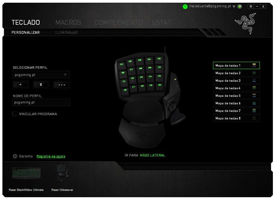Através do software Razer Synapse 2.0, podemos atribuir diferentes funções a cada uma das teclas e botões do Razer Orbweaver. Isso é possível na primeira aba da aplicação, onde podemos personalizar todas as teclas do keypad, em três mapas de teclas diferentes, que podemos alternar instantaneamente no Orbweaver enquanto jogamos.