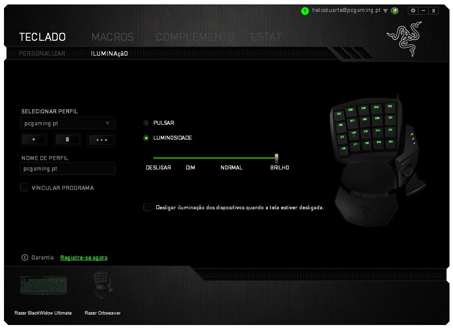 Tal como acontece com outros periféricos retroiluminados da marca Razer, o Razer Synapse 2.0 permite-nos ligar/desligar e definir o nível e estilo de iluminação do Orbweaver, assim como gravar as nossas próprias macros.