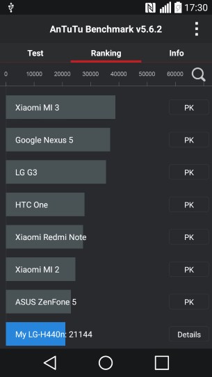 Como é habitual nas análises a smartphone que realizamos aqui na Wintech, recorremos à aplicação de benchmark Antutu para comparar a pontuação do LG Spirit 4G LTE com a de outros equipamentos disponíveis no mercado. A classificação final foi de 21144 pontos, colocando o LG Spirit 4G LTE a uma posição do ASUS Zenfone 5.
