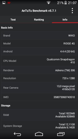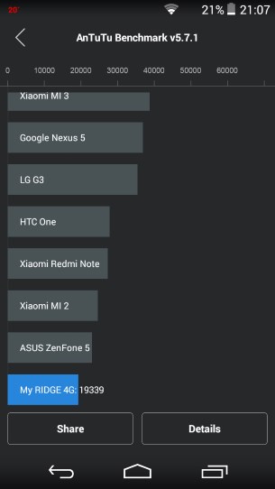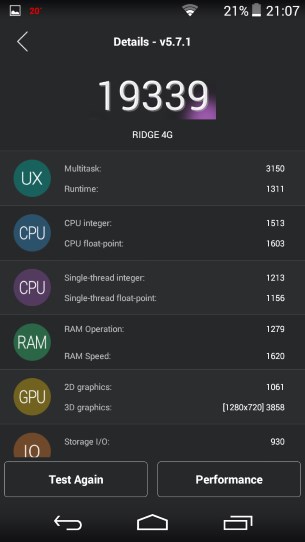 Como é habitual nas nossas análises, realizámos o tradicional teste de benchmark recorrendo à App Antutu. Os resultados obtidos não surpreendem, tendo o Wiko Ridge 4G conseguido uma pontuação de 19339 pontos, um resultado, por exemplo, ligeiramente abaixo ao apresentado pelo ZenPhone 5 da ASUS.