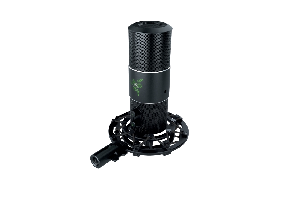 Como já referimos, o microfone é composto por duas peças: um suporte metálico com uma base alicerçada por um apoio antiderrapante e o microfone propriamente dito que, se apresenta num formato cilíndrico num corpo de alumínio e onde sobressai o símbolo iluminado da Razer.