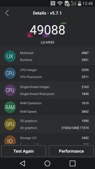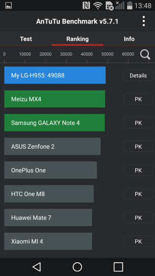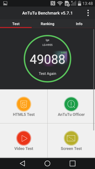 Como é habitual nas análises a smartphone que realizamos aqui na Wintech, recorremos à aplicação de benchmark Antutu (versão 64-bit) para comparar a pontuação do LG G Flex 2 com a de outros equipamentos disponíveis no mercado. A classificação final foi de 49088 pontos, colocando o LG G Flex 2 à frente de alguns dos equipamentos mais evoluídos do mercado.