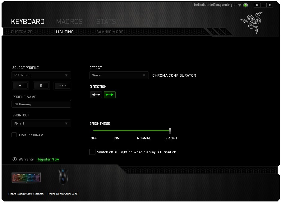 Todo em preto, o BlackWidow Chroma atinge o seu auge quando o ligamos a retroiluminação. Existem vários padrões e opções de iluminação, que utilizam 16.8 milhões de cores para dar vida ao teclado. Desde a onda que percorre o teclado com todas as cores, a uma configuração mais estática com diferentes níveis de iluminação, são praticamente infinitas a possibilidades de personalização que o BlackWidow Chroma nos oferece. Neste aspeto, é sem dúvida bastante bonito ver as teclas a mudar de cor em diferentes direções e velocidades, mas na prática preferimos uma configuração estática e com um nível de iluminação intermédio para trabalhar.