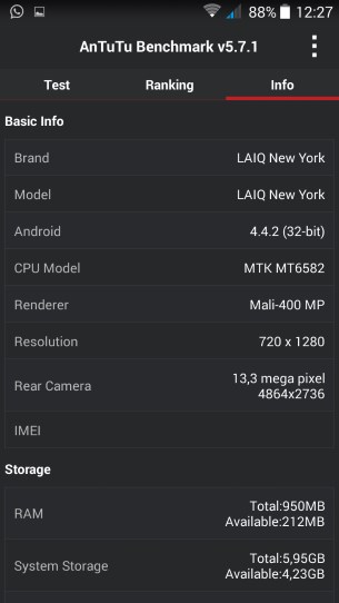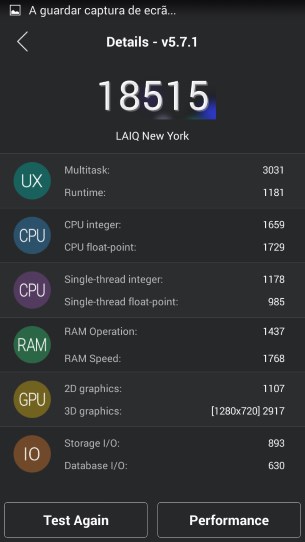 O LAIQ New York conseguiu obter 18515 pontos nos testes efetuados, um resultado aceitável para um equipamento deste tipo e que, comparativamente a outros testes efetuados pela Wintech, fica um pouco abaixo do Wiko Highway Pure 4G e do Alcatel OneTouch Idol 3.