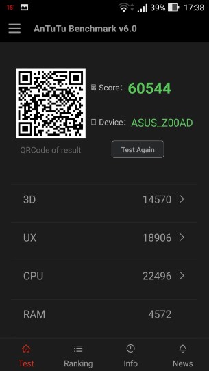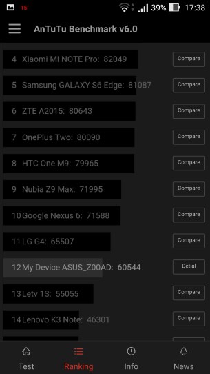 Como é habitual procedemos ao teste de Benchmark com recurso à aplicacao Antutu. Desta feita, o resultado obtido foi de 60 544 pontos, um resultado bastante bom…. Veja-se a tabela de comparação da própria Antutu…