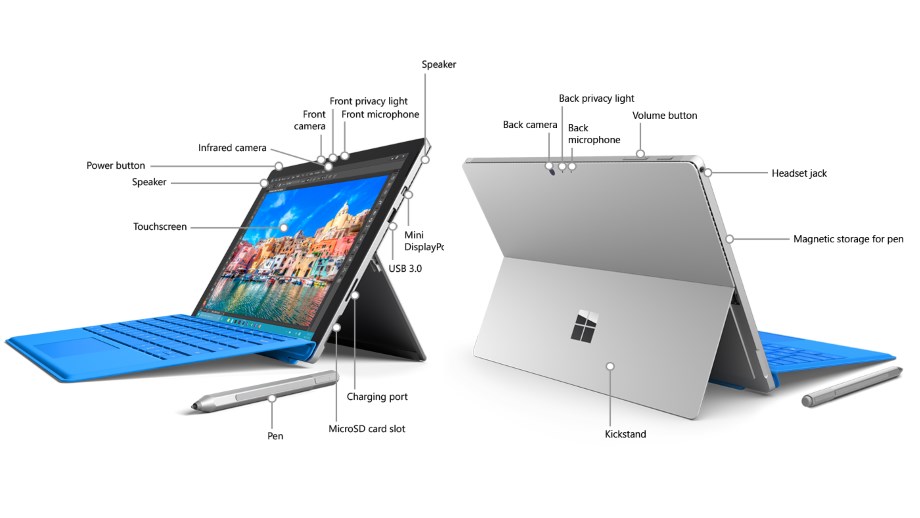 A Microsoft continuou a manter a ligação USB 3.0 “full-size”, uma porta miniDisplay, uma ligação para um jack de 3,5 mm que permite ligar uns auscultadores, por exemplo e um KickStand ainda mais flexível que pode chegar ao um angulo de 150º e que permite ao utilizador otimizar a forma de apoiar o tablet conforme a sua necessidade ou gosto enquanto trabalha. Bem atrás do KickStand está localizado um pequeno slot que permite a integração de um cartão de memoria microSD.