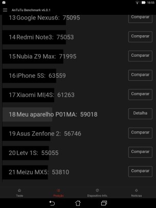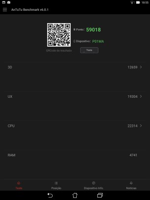 Nos nossos testes de Benchmark, onde recorremos ao nossos bem conhecido Antutu, os resultados obtidos classificaram o ASUS ZenPad S 8.0 com 59018 pontos. Uma classificação que o coloca, por exemplo, ligeiramente acima do smartphone (também da ASUS) Zenfone 2.