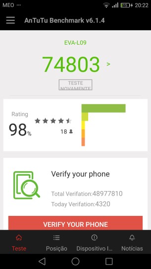 Mais uma vez para realizarmos os testes de Benchmark optámos por recorrer à nossa “fiel amiga” Antutu. O resultado obtido foi de 74803, um resultado bastante bom e que não surpreende face aos componentes de hardware que servem de sustentação a este Huawei P9.