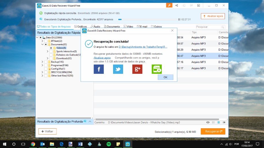 Após este processo, somos abordados a definir uma pasta para onde devem ser “recuperados” os ficheiros. Feito isto, a recuperação é feita e a pasta de ficheiros recuperados surge com os dados pretendidos…