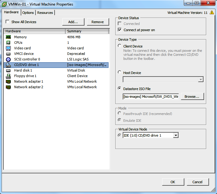 Devemos incluir a ISO na nossa VM e ativar o CDROM Virtual (“Connect at power on”).