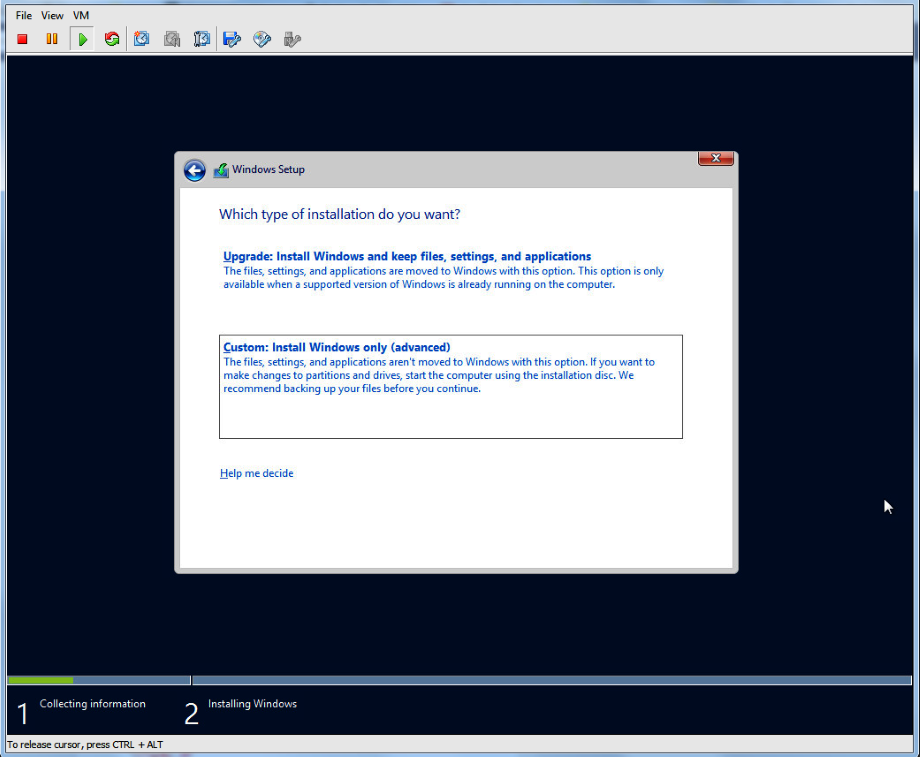 A seguir iremos escolher que tipo de instalação iremos efetuar. Podemos fazer um upgrade, ou uma nova instalação. No nosso caso é uma nova instalação. Assim sendo, escolhemos “Custom”.