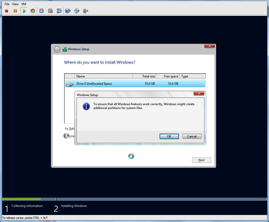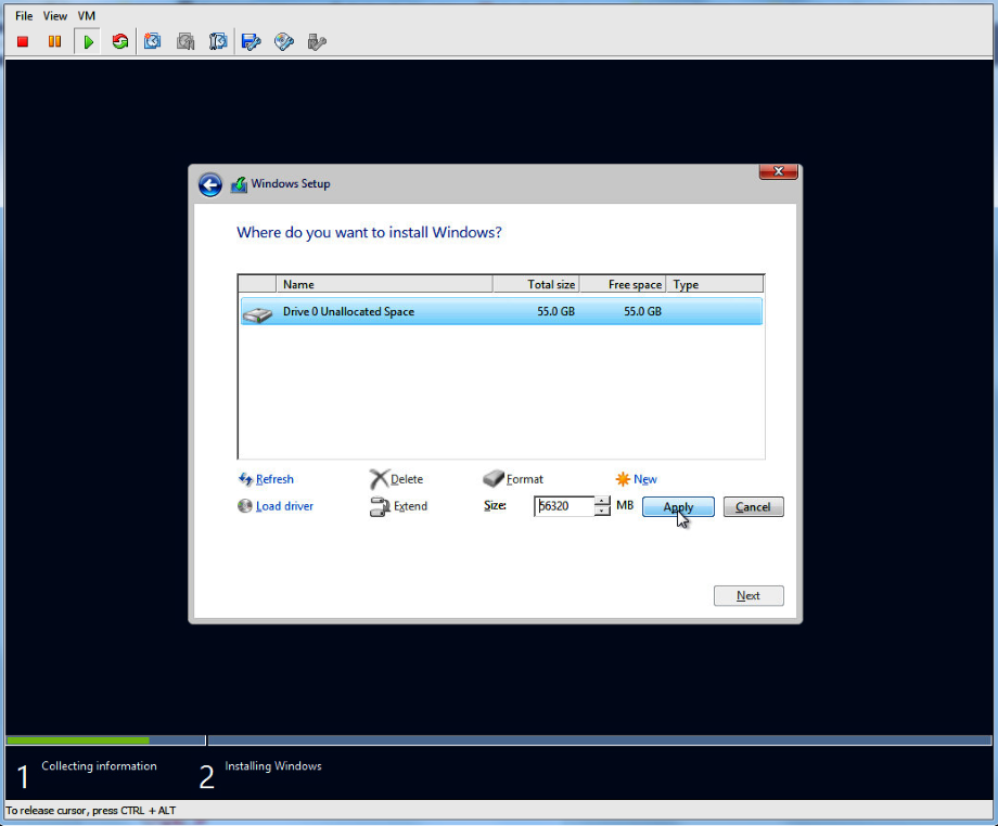 No caso em concreto iremos usar todo o espaço disponível para instalar o SO. Mas por exemplo se tiverem criado um disco com 100/200Gb, não faz sentido usar todo o espaço em disco para a instalação do SO. Pessoalmente nunca gostei de instalar o SO operativo na mesma partição que instalo as aplicações. Porque em caso de reinstalação do SO, não perdemos os dados que temos na segunda partição. Mas neste caso iremos criar uma partição com o total do disco (55GB).