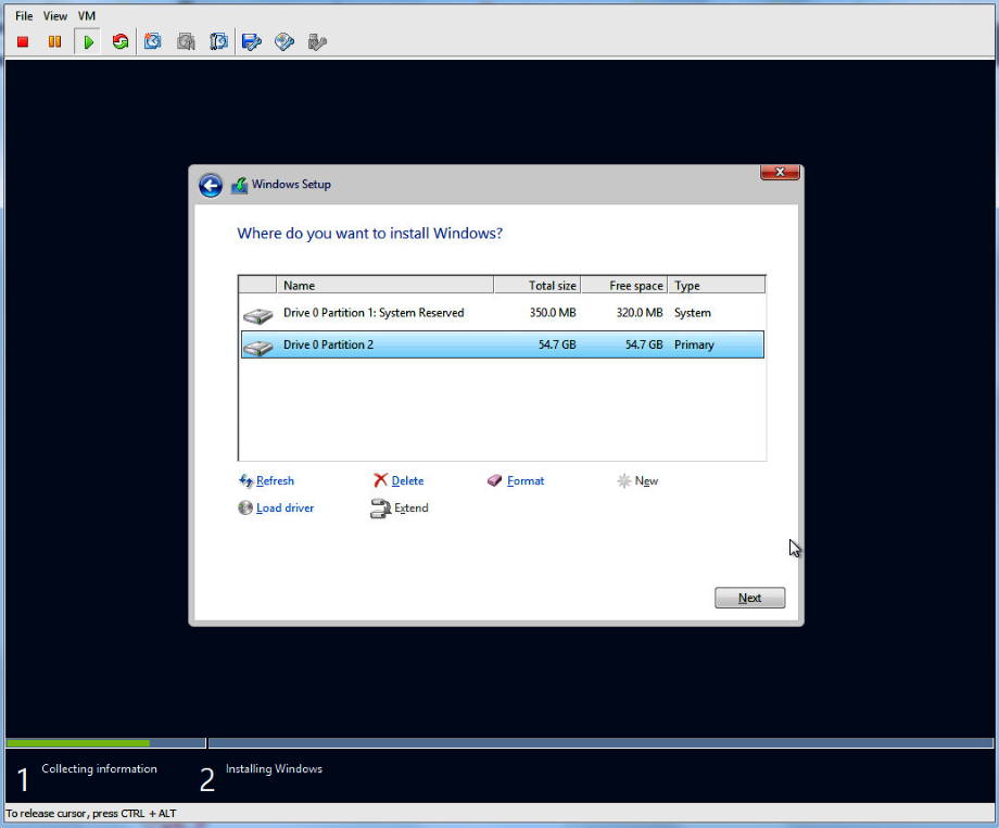 Temos neste momento 2 partições. Para a instalação do SO temos de escolher a partição 2. Como referido, a partição 1 (System Reserved) é apenas usada pelo Windows.