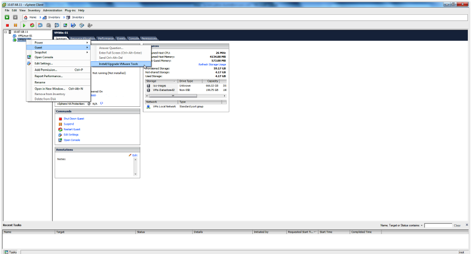 Voltemos então ao nosso ESXi e na Maquina Virtual que instalamos o Windows 2012 clicar lado direito do rato e escolher a Opção “Guest – Install/Upgrade VMware Tools”.