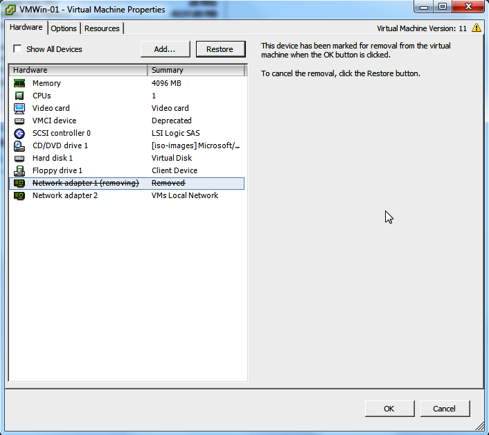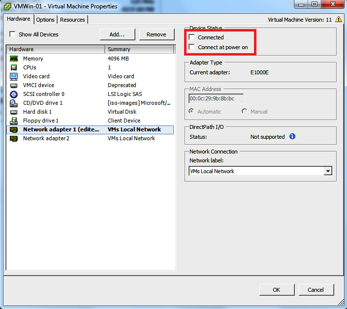 Selecionamos a placa de rede que queremos eliminar (neste caso Network Adapter 1) e removemos as opções “Connected” e “Connect at power on”.