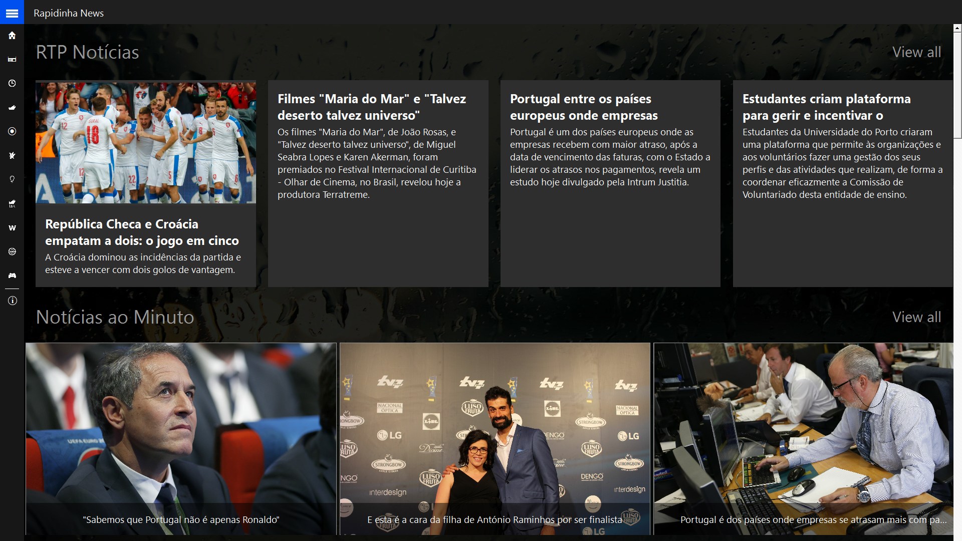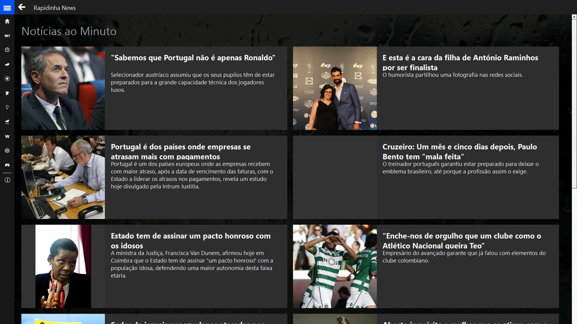 A App “Rapidinha News” é, na sua essência, um agregador de noticias que permite visualizar parcialmente ou na integra as mais recentes noticias provenientes dos mais variados sites portugueses dedicados aos mais diversos tipos de assuntos: sociedade, desporto, tecnologia e videojogos.