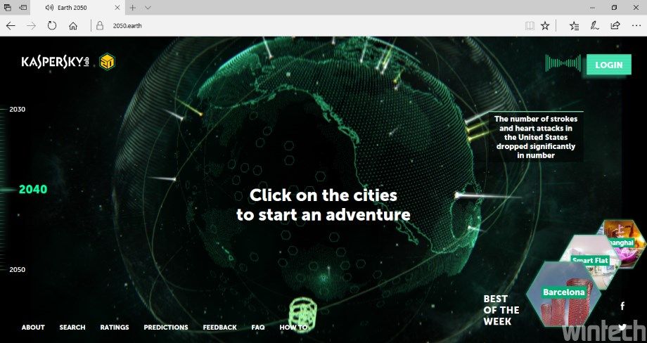 De momento, o Earth 2050 contém previsões para 80 cidades à volta do mundo. Os utilizadores podem selecionar qualquer uma delas e as previsões aparecerão na parte superior do mapa. O portal é dividido em três categorias temporais: 2030, 2040 e 2050, cada uma delas contendo previsões de pessoas que são especialistas reconhecidas nas suas áreas de atuação. Por exemplo, os utilizadores podem explorar os pensamentos de Ian Pearson e outros especialistas da Kaspersky Lab, sobre o que o futuro reserva.